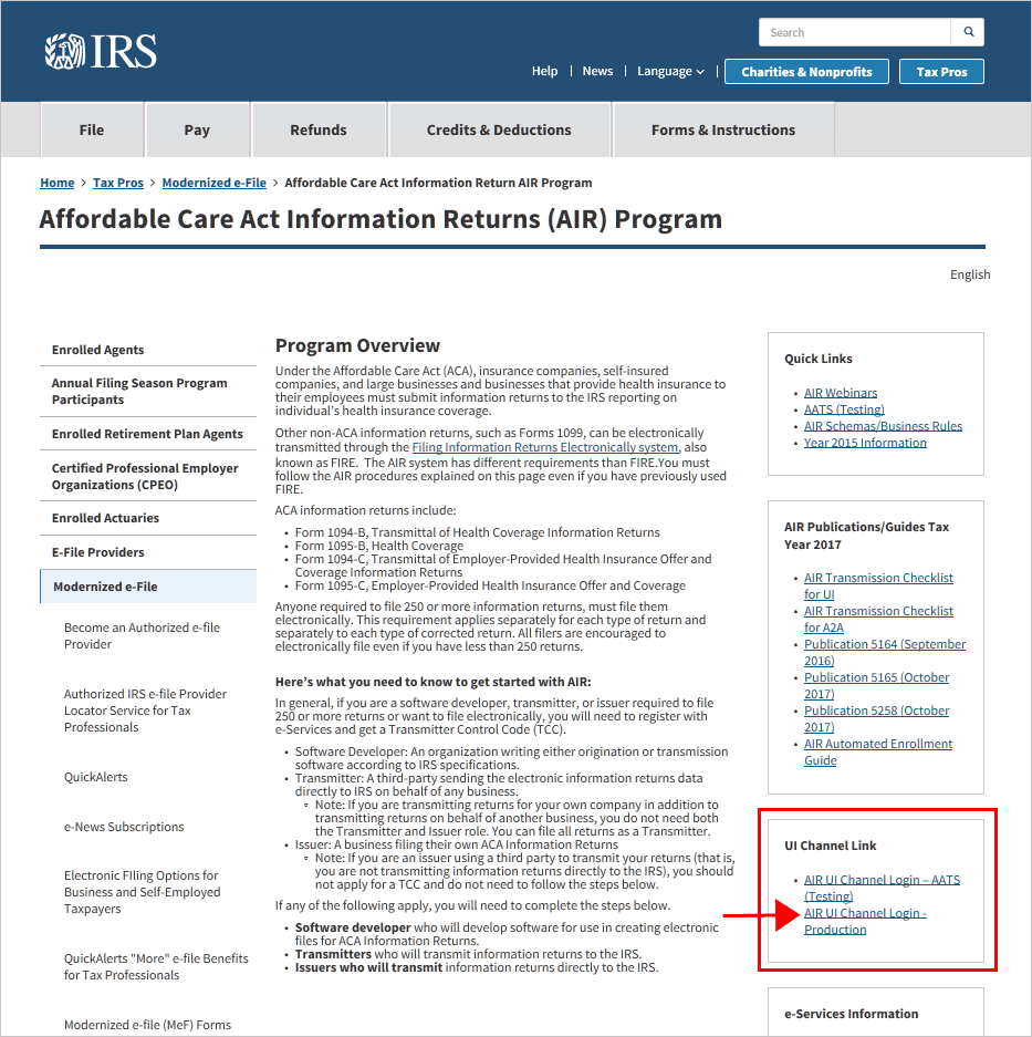 1. Use Internet Explorer 8 or higher to navigate to https://www.irs.gov/for-Tax-Pros/Software-Developers/Information-Returns/Affordable-Care-Act-Information-Return-AIR-Program