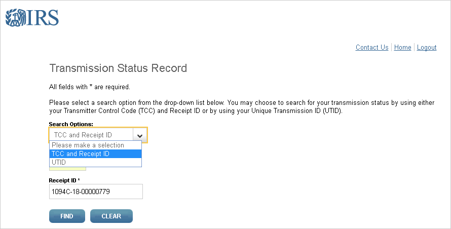 Enter your ACA Transmitter Control Code (TCC) number and the Receipt ID from the transmission confirmation page (see step 10).