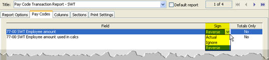 The sign is the sign that is normally associated with a pay code. Use actual to record the transaction using the sign that is normally assigned to the pay code. Use reverse to record the transaction using the opposite sign from the actual sign. Use ignore to record the transaction with a positive value.