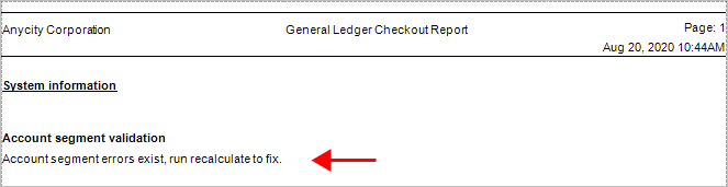 Running Checkout will always search for GL accounts with missing segments. If a GL account has a missing segment, an error message will be included on the error report that prints after you run Checkout.