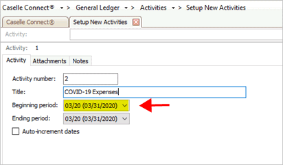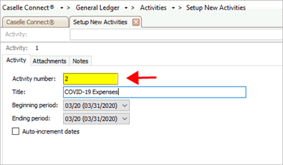 After activity reporting is set up in General Ledger and the subsystems, create an activity to track COVID-19 expenses.