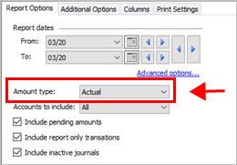 Use With Balances or Activity to include only accounts that have a balance or have transactions recorded during the report date range.