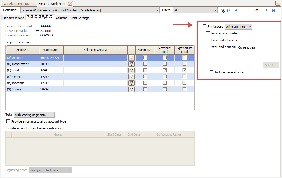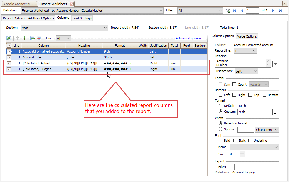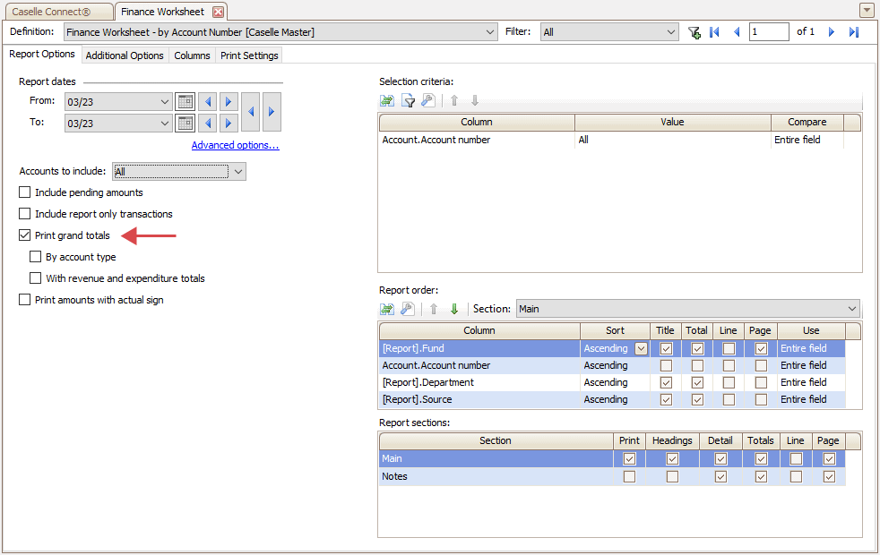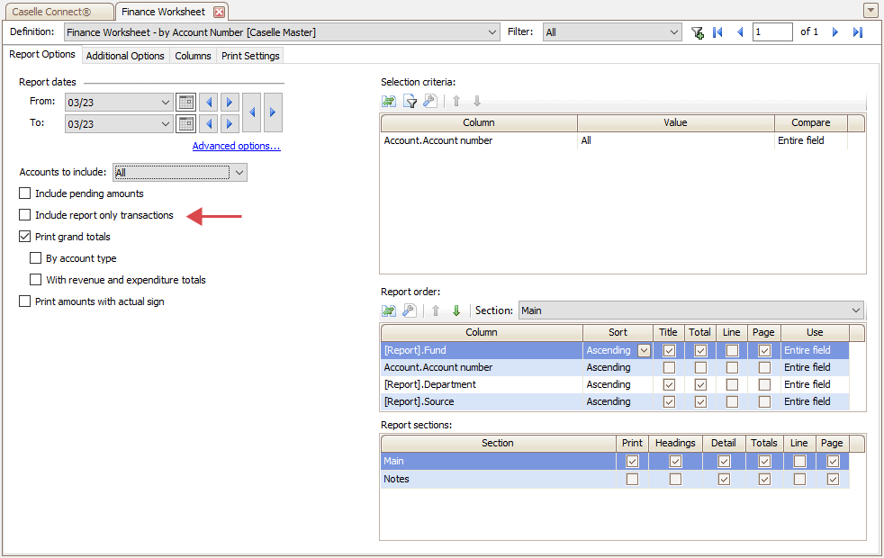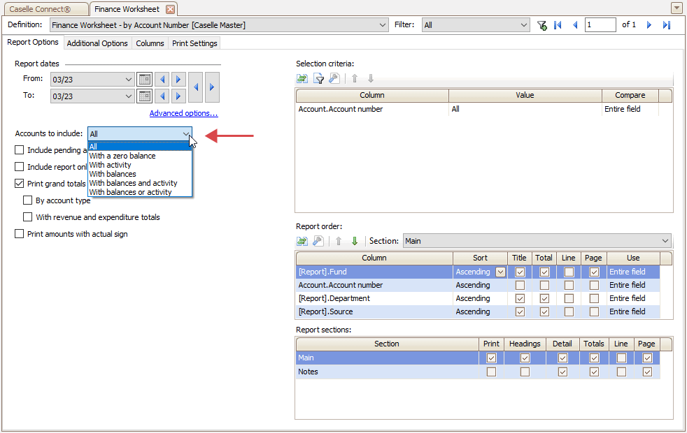 2. Select Finance Worksheet - by Account Number [Caselle Master] as the report definition.