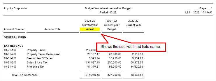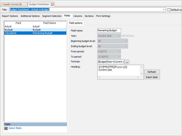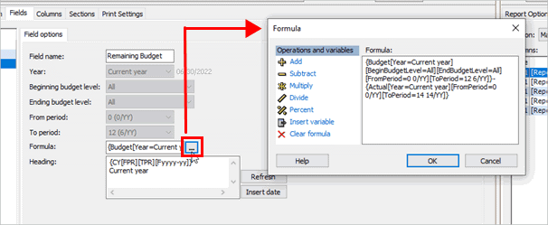 Set up a field to calculate an amount. For example, this report column calculates the difference between the current year beginning budget amount and the current year actual budget amount.