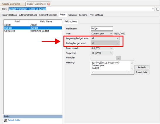 If you have selected a budget field, the default setting will select All. You can change the budget level to use a specific budget level as the budget beginning and ending level.