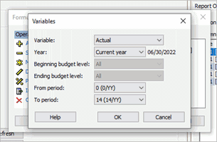 {Budget[Year=Current year][BeginBudgetLevel=All][EndBudgetLevel=All][FromPeriod=0 0/YY][ToPeriod=12 6/YY]}-{Actual[Year=Current year][FromPeriod=0 0/YY][ToPeriod=14 14/YY]}