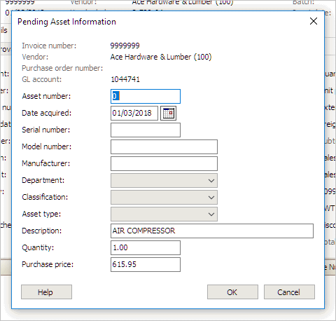 Now, when you enter an invoice, Accounts Payable will show a dialog box that will prompt the user to add a new asset.