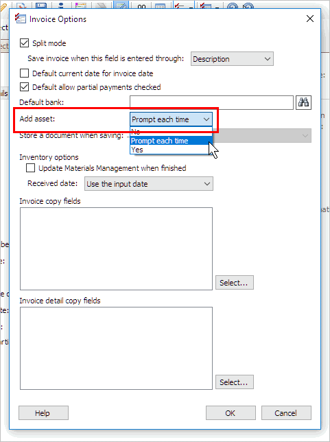You can set up the default options (Accounts Payable > Invoices > Enter Invoices > Options (F12)) to prompt each time, yes to always add a new asset, or no to never add a new asset. For more information, see the help topic titled How do I create new asset records from an invoice?
