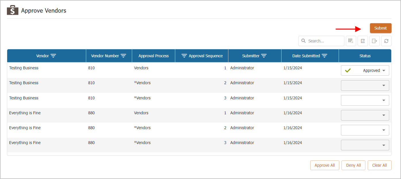 The vendors who have been assigned to you as an approver will be displayed in the grid. Vendors that have been assigned to a different approval step or approval group that you have not been assigned to will not be displayed.