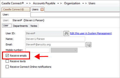 Send notifications to the user's email address. The user's email address that's stored in the Setup/Modify User Rights displays in the Mobile Number field. To add or update the user's email address, see the help topic titled How do I update a user's notification email or mobile number?