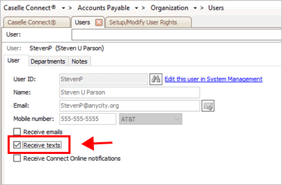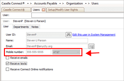 Send text notifications to the user's mobile number. The user's mobile number that's stored in the Setup/Modify User Rights displays in the Mobile Number field. To add or update the user's mobile number, see the help topic titled How do I update a user's notification email or mobile number?
