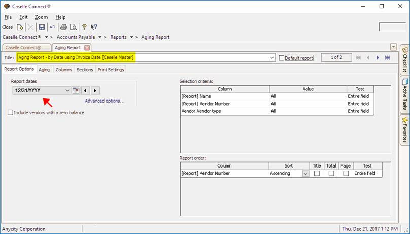 1. Open Connect Accounts Payable > Reports > Aging Report.