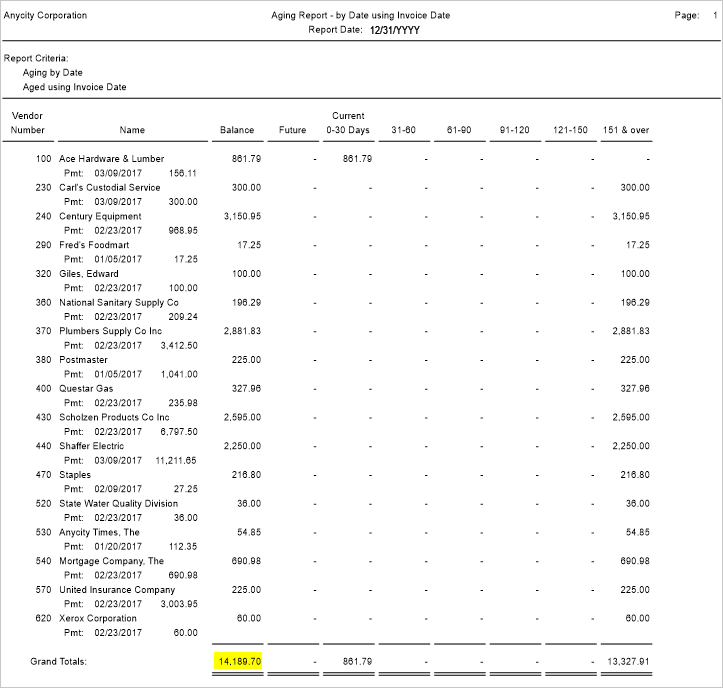 Aging Report by Date using Invoice Date for 12/31/YYYY