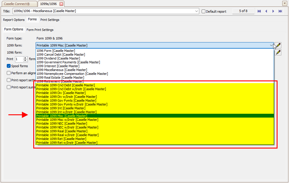 Follow the instructions in Step 10 to print 1099s to plain paper. On the Forms tab, select the option to choose the "Printable 1099 [Form Type] [Caselle Master]".