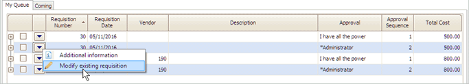 If you can see the option to Modify Existing Purchase Orders but you can't click on it, the approval process does not allow approvers to change the details on an existing purchase order. See the help topic titled How do I allow approvers to change requisition details?