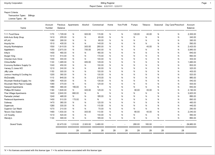 Billing Register for 01/01/YYYY to 12/31/YYYY