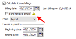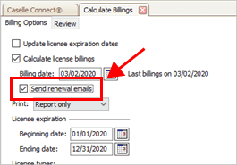 When you're done setting up the email template to renew licenses, open the Calculate Billings routine and you'll find that you can select the Send Renewal Email checkbox without displaying a warning.