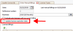 When you enter a manual billing, you can also update the license expiration date. The license expiration date will use the rules that are set up in the license type to calculate the new license expiration date. This checkbox is only available in New mode.