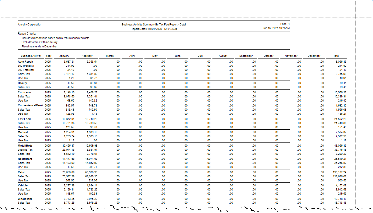 A business activity summary by tax fee report breaks down a business's activities by the specific taxes and fees it is responsible for collecting and remitting. This type of report is typically used to provide detailed information to tax authorities or internal stakeholders regarding the allocation and payment of various tax obligations.
