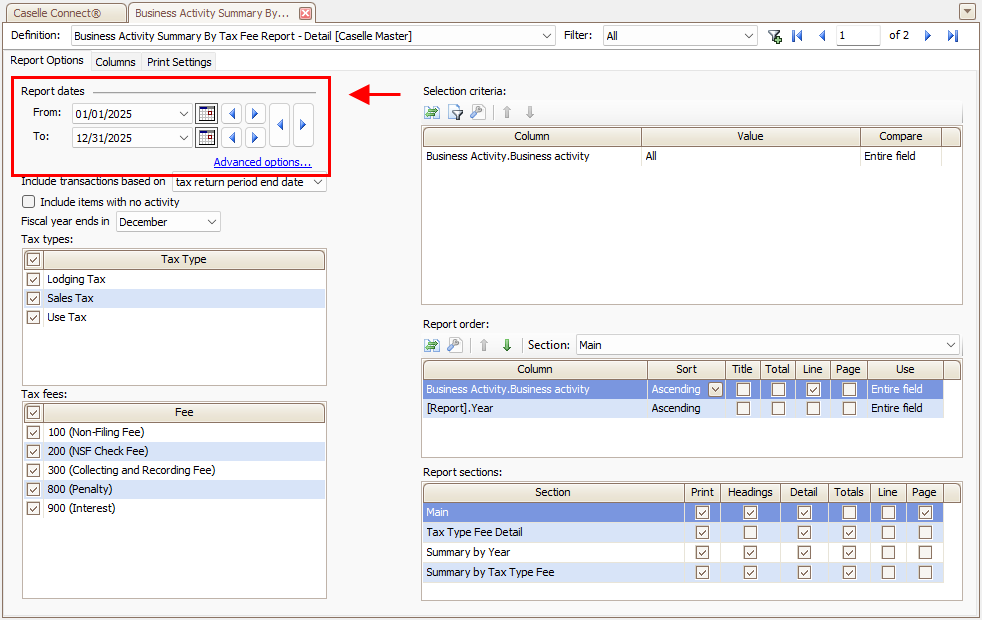 1. Open Connect Business Tax Collection > Reports > Business Activity Summary by Tax Fee Report.