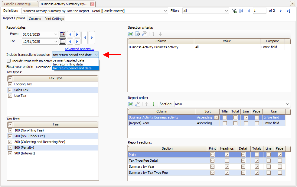 Business activity summary by tax fee report - Detail [Caselle Master]