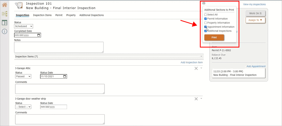 Set up the inspection print options to include the inspection appointment information. When you print the inspection details page, it will include the appointment date and time.
