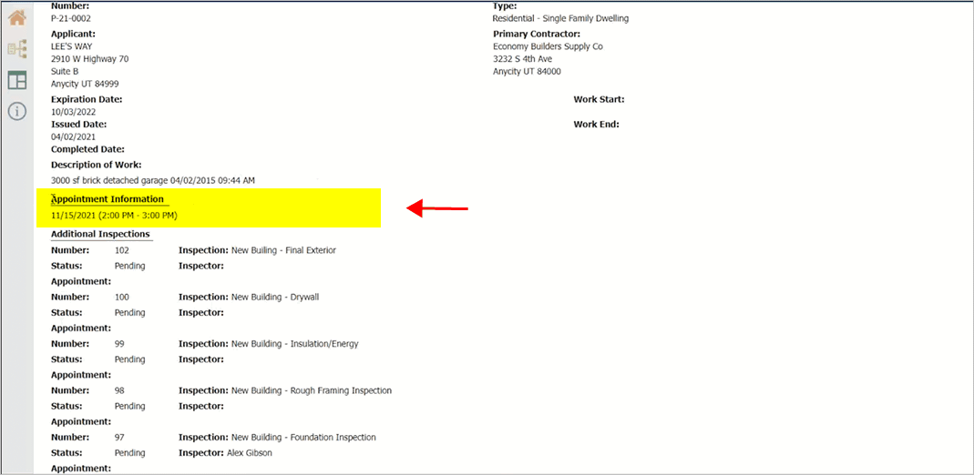 Connect Online, Inspection Appointment Information