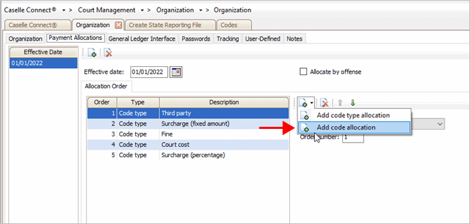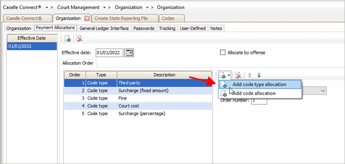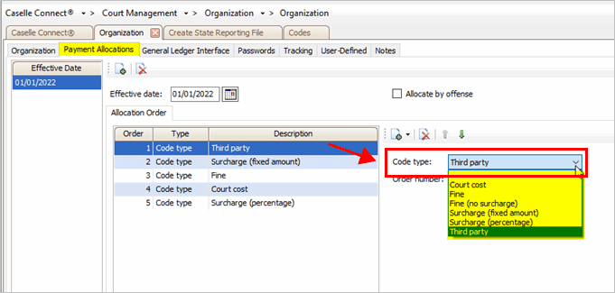 Use the Code Type list to select the code type that will receive the allocated payment. The code type refers to a group of codes assigned to a specific purpose; such as a fine or court cost. While a code refers to the codes defined in Organization > Codes.