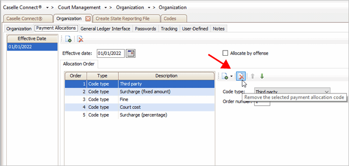 The allocation order refers to the order that payments will be distributed when there are multiple amounts due on a case. Use the options on the Allocation Order subtab to define the payment order by code or code type.