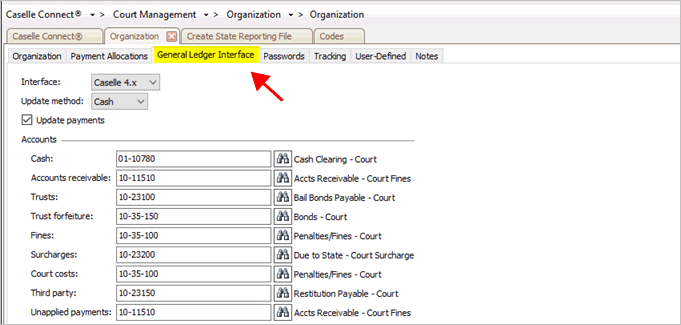 Use this section to record the default GL accounts for cash, accounts receivable, trusts, trust forfeiture, fines, surcharges, court costs, third party, and unapplied payments.