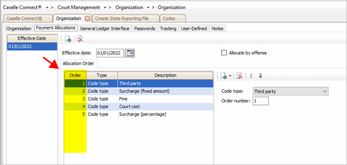 5. Use the Order Number field to assign the allocation order. The system will use the assigned number to determine the payment allocation order, where the code type assigned to the number 1 is paid first.