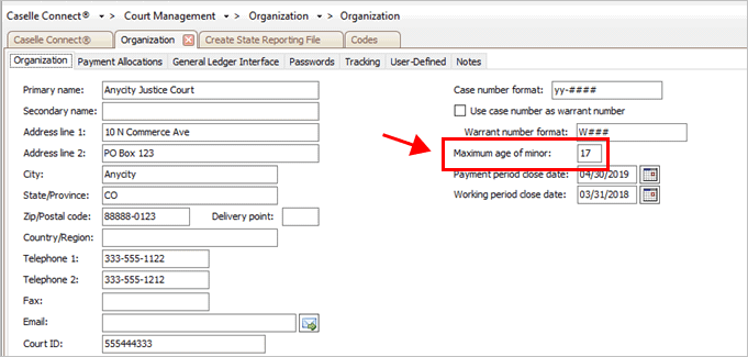 The Maximum Age of Minor is the greatest age a defendant will be subject to rules regarding minors. Most states set the age of a minor between the age of 17 and 20. The application will use the value stored in the Maximum Age of Minor field to determine when to provide a warning regarding the age of the defendant in routines, letters, and forms as well as when to include the case when printing.