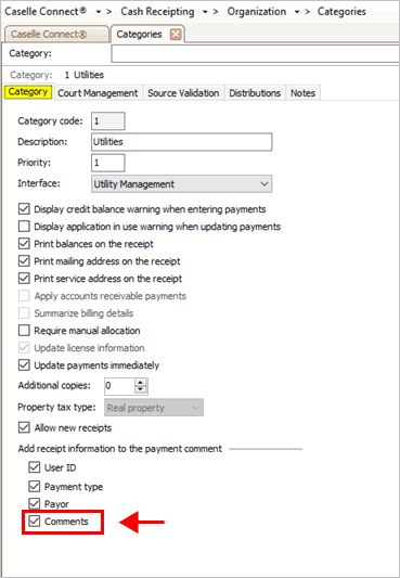 3. Find the section titled Add Receipt Information to the Payment Comment on the Category tab.
