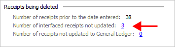 The number of unupdated receipts to the General Ledger are displayed in the section titled Receipts Being Deleted as a hyperlink.