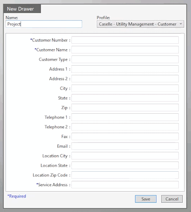 The New Drawer form displays. This image displays the fields that are linked to the Caselle - Utility Management - Customer profile. The New Drawer form that displays on your screen may be linked to a different profile and you may see different fields on your form.
