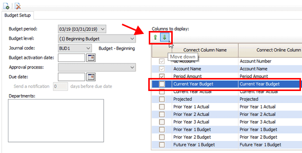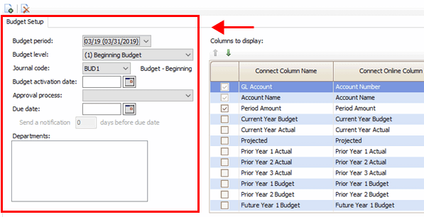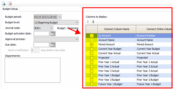 The section titled Columns to Display, on the right side of the screen, will show the columns that have been set up in the budget level.