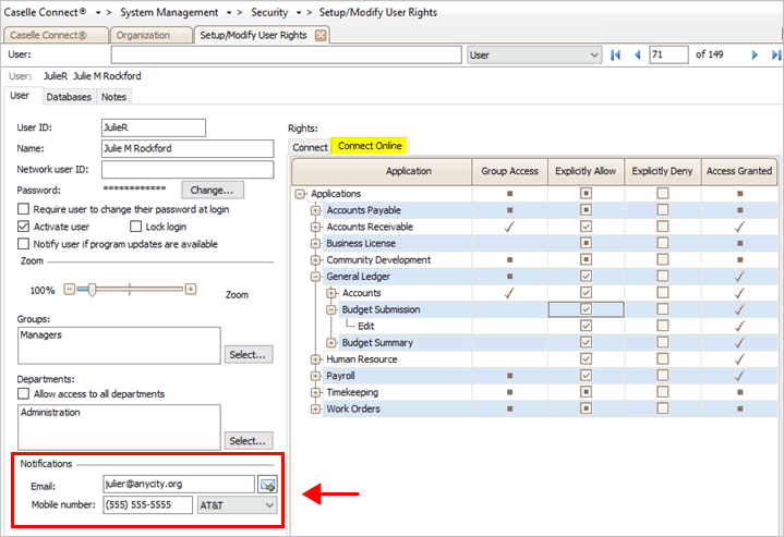 Then, set up the user with user rights for online budget submission and notifications for online budget submission.