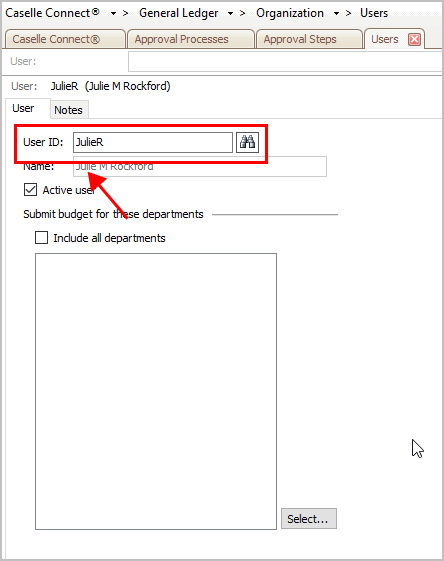 This user will review the budgets for the selected departments. Remove the checkmark from the Include All Departments checkbox and then click Select to choose the departments.