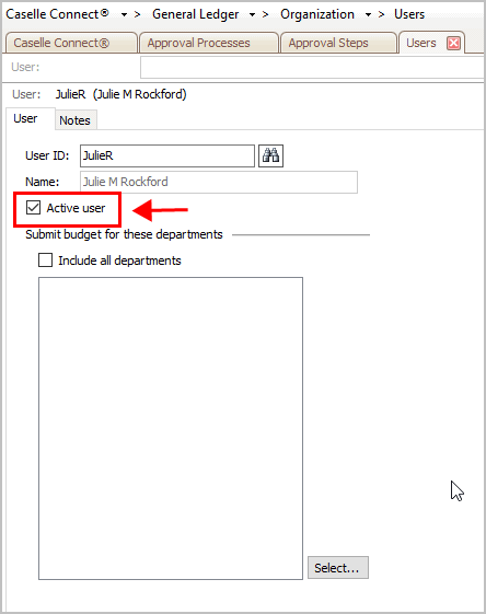 Use this option to remove an active user from General Ledger who has submitted a budget or has been assigned to a budget for submission. Only active users can submit budget requests. Once a user is not active, the user will not be able to submit budget requests.