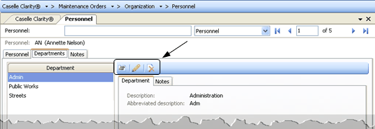Select the personnel that belong to the department. You can link personnel to multiple departments. For example, an individual may work for the Street department but he also works part time for the Parks department. Assigning personnel to a department will make life a little easier when it's time to create or complete a maintenance order. Assigning personnel will limit the number of names that appear in the Personnel drop-down list to only the names of the individuals who are associated with the department.