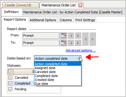 Generate the report using dates based on the action completed date, assigned date, canceled date, completed date, create date, or due date.