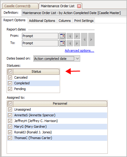 Filter the report contents based on the maintenance order status: canceled, completed, and pending. You can select more than one status.