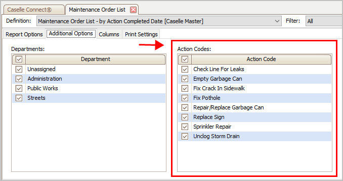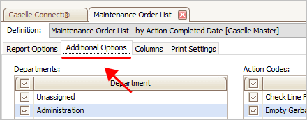 Select the checkbox next to a department to include maintenance orders that have been created by the department.