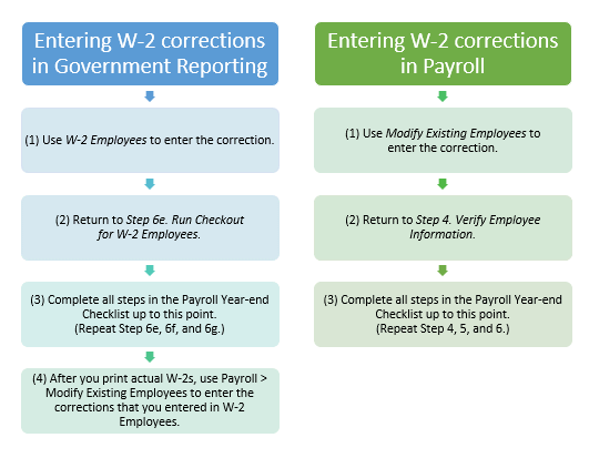 Entering W-2 corrections in Payroll means you'll need to repeat more steps in the Payroll year-end checklist, but you only have to enter the corrections once. Because you will repeat the step to convert the year-end tax information, the changes that you have made to the employee's record in Payroll will be updated to the Government Reporting application.