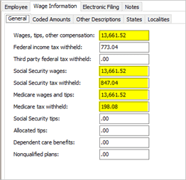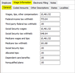 5. On the Wage Information > General subtab, enter the new totals for the combined amounts into each of the W-2 boxes.