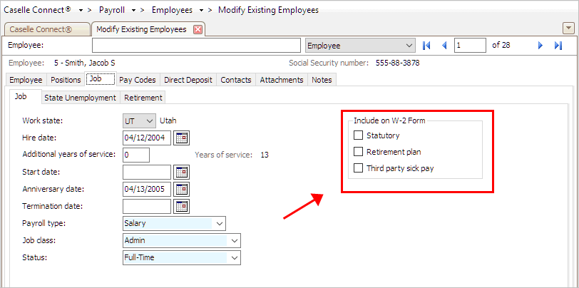 The next step is to review the employee’s Social Security number, subject to pay codes, and employee options for the W-2 Form.