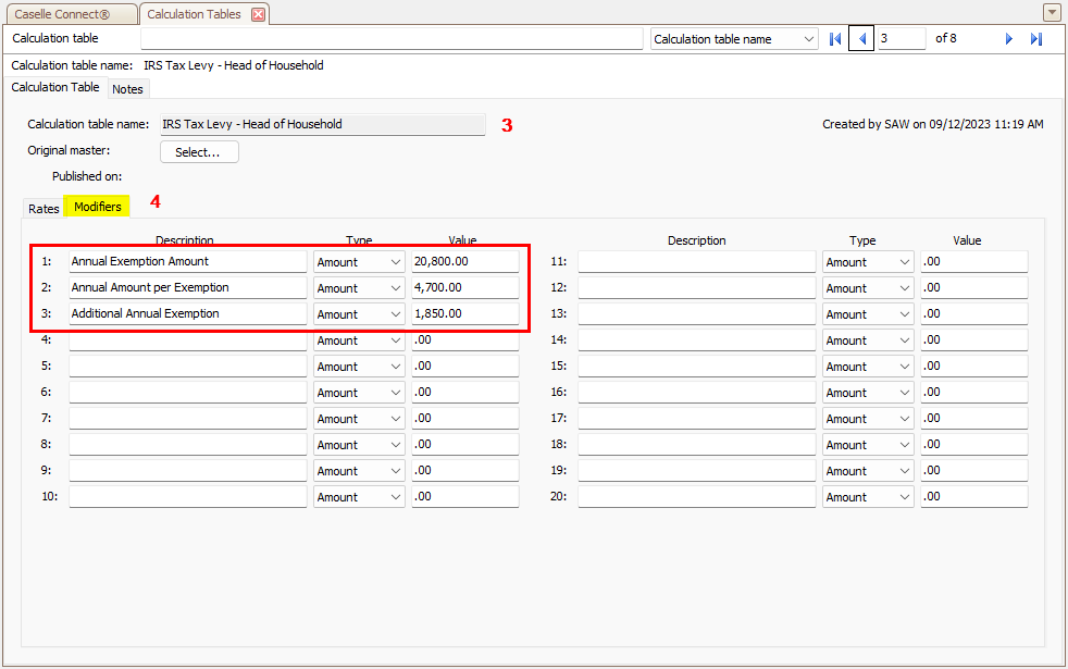 3. In the Calculation Table Name box, enter IRS Tax Levy - Head of Household.