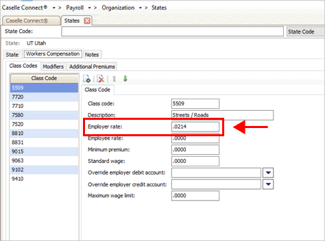 2. Click to select the Workers Compensation tab > Class Codes tab.