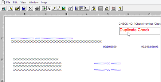 Set up another payroll check form definition for reprinting a payroll check. Add the text "Duplicate Check" to the form layout for payroll checks and then save it as a new form layout.