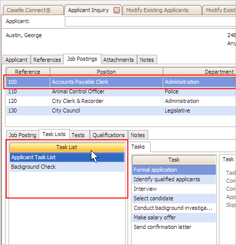 The Task List pane displays all of the task lists that have been assigned to the applicant. Clicking on a task list will show you the tasks. If you need to update an applicant's tasks or task lists, see the help topic titled How do I add a task list to job posting?